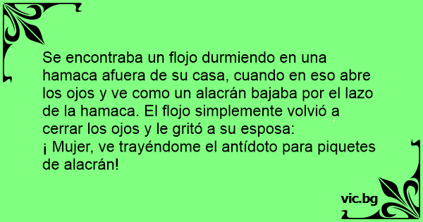 Se encontraba un flojo durmiendo en una hamaca afuera de su casa, cuando en eso abre los ojos y ve como un alacrán bajaba por el lazo de la hamaca. El flojo simplemente volvió a cerrar los ojos y le gritó a su esposa: