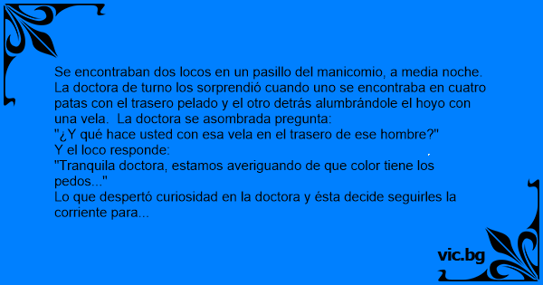 Se encontraban dos locos en un pasillo del manicomio, a media noche. La doctora de turno los sorprendió cuando uno se encontraba en cuatro patas соn el trasero pelado y el otro detrás alumbrándole el hoyo соn una vela. La doctora se asombrada pregunta: