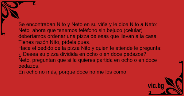 El pizzero le pregunta al cliente: - ¿Le corto su pizza en 4 u 8 pedazos? Y el cliente le contesta: - En 4 nomás, no creo que me coma 8 pedazos.