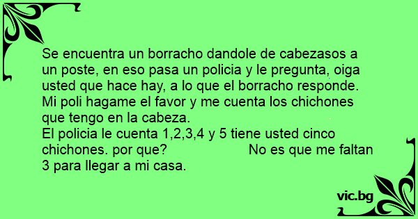 Se encuentra un borracho dandole de cabezasos a un poste, en eso pasa un policia y le pregunta, oiga usted que hace hay, a lo que el borracho responde. Mi poli hagame el favor y me cuenta los chichones que tengo en la cabeza.