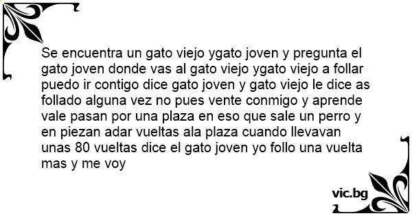 Se encuentra un gato viejo ygato joven y pregunta el gato joven donde vas al gato viejo ygato viejo a fоllаr puedo ir contigo dice gato joven y gato viejo le dice as follado alguna vez no pues vente conmigo y aprende vale pasan por una plaza en eso que sale un реrrо y en piezan adar vueltas ala plaza cuando llevavan unas 80 vueltas dice el gato joven yo follo una vuelta mas y me voy