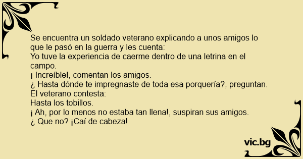Se encuentra un soldado veterano explicando a unos amigos lo que le pasó en la guerra y les cuenta: