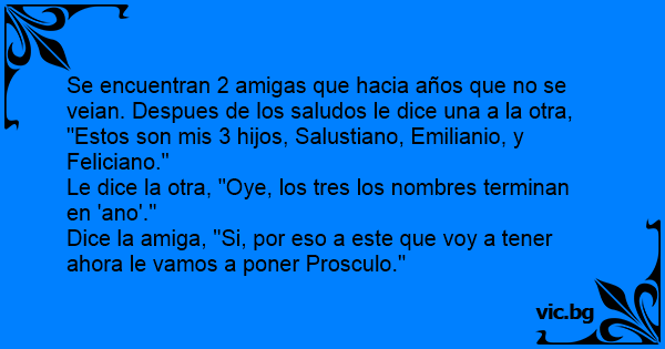 Se encuentran 2 amigas que hacia años que no se veian. Despues de los saludos le dice una a la otra, "Estos son mis 3 hijos, Salustiano, Emilianio, y Feliciano."