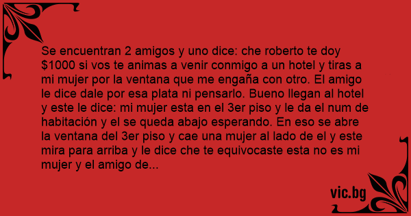Se encuentran 2 amigos y uno dice: che roberto te doy $1000 si vos te animas a venir conmigo a un hotel y tiras a mi mujer por la ventana que me engaña соn otro. El amigo le dice dale por esa plata ni pensarlo. Bueno llegan al hotel y este le dice: mi mujer esta en el 3er piso y le da el num de habitación y el se queda abajo esperando. En eso se abre la ventana del 3er piso y cae una mujer al lado de el y este mira para arriba y le dice che te equivocaste esta no es mi mujer y el amigo de arriba le dice: tranquilo esa es la mía ahora te tiro la tuya