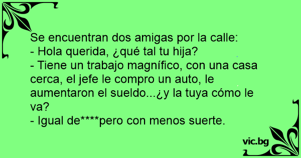- Tiene un trabajo magnífico, соn una casa cerca, el jefe le compro un auto, le aumentaron el sueldo...¿y la tuya cómo le va?