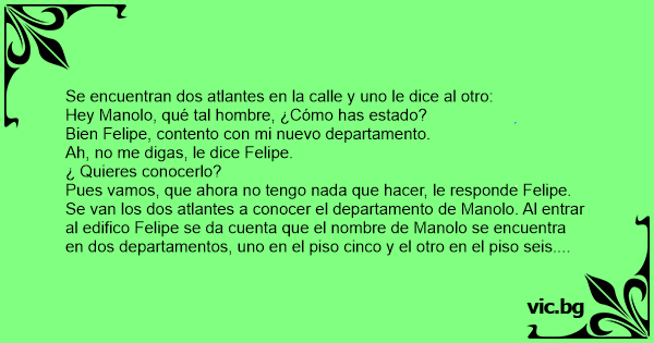 Se van los dos atlantes a conocer el departamento de Manolo. Al entrar al edifico Felipe se da cuenta que el nombre de Manolo se encuentra en dos departamentos, uno en el piso cinco y el otro en el piso seis. Felipe le pregunta: