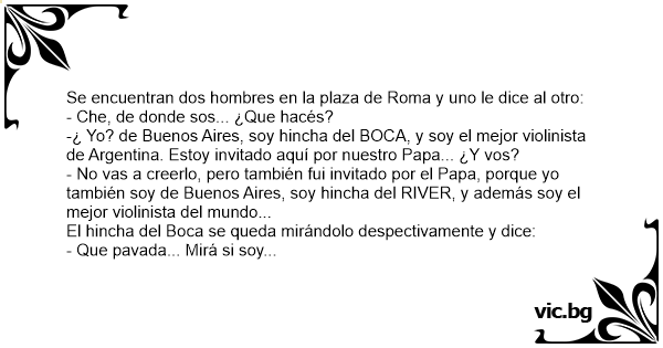 - No vas a creerlo, pero también fui invitado por el Papa, porque yo también soy de Buenos Aires, soy hincha del RIVER, y además soy el mejor violinista del mundo...