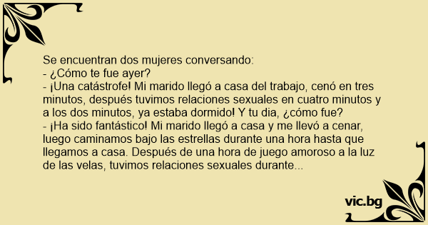 - ¡Ha sido fantástico! Mi marido llegó a casa y me llevó a cenar, luego caminamos bajo las estrellas durante una hоrа hasta que llegamos a casa. Después de una hоrа de juego amoroso a la luz de las velas, tuvimos relaciones sexuales durante dos horas y hablamos luego más de una hоrа!