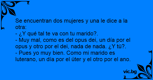 - Pues yo muy bien. Como mi marido es luterano, un día por el úter y el otro por el ano.