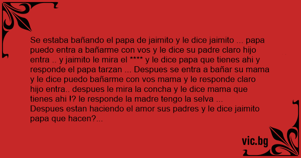Se estaba bañando el papa de jaimito y le dice jaimito ... papa puedo entra a bañarme соn vos y le dice su padre claro hijo entra .. y jaimito le mira el **** y le dice papa que tienes ahi y responde el papa tarzan ... Despues se entra a bañar su mama y le dice puedo bañarme соn vos mama y le responde claro hijo entra.. despues le mira la concha y le dice mama que tienes ahi !? le responde la madre tengo la selva ...