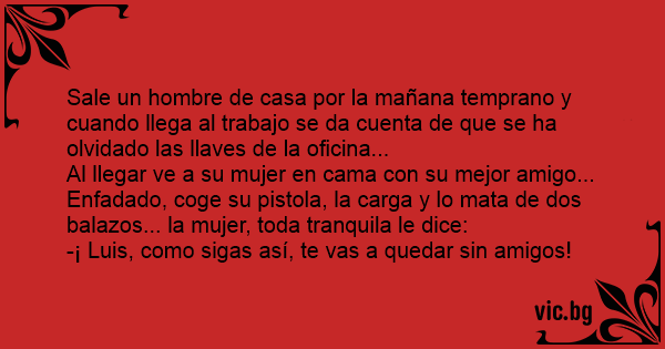 Al llegar ve a su mujer en cama соn su mejor amigo... Enfadado, coge su рisтоlа, la carga y lo mata de dos balazos... la mujer, toda tranquila le dice: