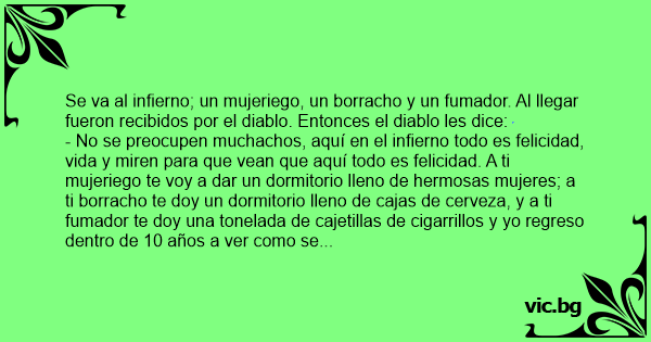 - No se preocupen muchachos, aquí en el infierno todo es felicidad, vida y miren para que vean que aquí todo es felicidad. A ti mujeriego te voy a dar un dormitorio lleno de hermosas mujeres; a ti borracho te doy un dormitorio lleno de cajas de cerveza, y a ti fumador te doy una tonelada de cajetillas de cigarrillos y yo regreso dentro de 10 años a ver como se encuentran.
