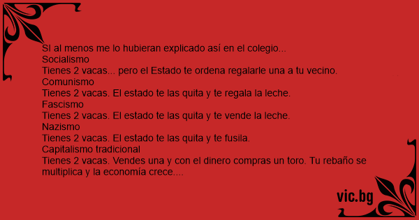 SOCIALISMO Tenés 2 vacas. Le regalás una a tu vecino. COMUNISMO Tenés 2 vacas. El estado te quita las dos y te regala un poco de la leche. FASCISMO Tenés 2 vacas. El estado te las quita y te vende...