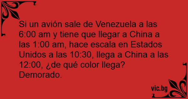 Si un avión sale de Venezuela a las 6:00 am y tiene que llegar a China a las 1:00 am, hace escala en Estados Unidos a las 10:30, llega a China a las 12:00, ¿de qué color llega?