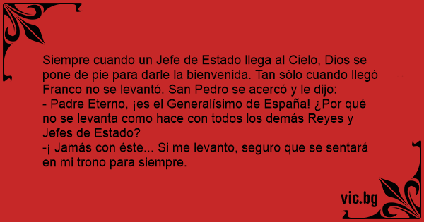 Siempre cuando un Jefe de Estado llega al Cielo, Dios se pone de pie para darle la bienvenida. Tan sólo cuando llegó Franco no se levantó. San Pedro se acercó y le dijo: