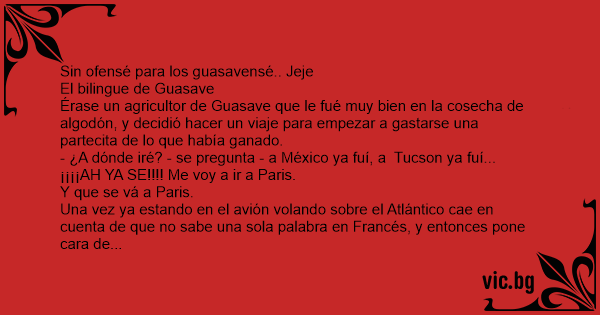 - ¡Ni se preocupe hombre! el Francés es refácil de hablar: nomás póngale una "e" al final de todo lo que diga y ya está.