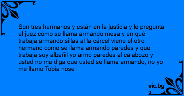 Son tres hermanos y están en la justicia y le pregunta el juez cómo se llama armando mesa y en qué trabaja armando sillas al la cárcel viene el otro hermano como se llama armando paredes y que trabaja soy albañil yo armo paredes al calabozo y usted no me diga que usted se llama armando, no yo me llamo Tobia nose