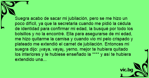 Suegra acabo de sacar mi jubilación, pero se me hizo un poco difícil, ya que la secretaria cuando me pidió la cédula de identidad para confirmar mi edad, la busqué por todo los bolsillos y no la encontré. Ella para asegurarse de mi edad, me hizo quitarme la camisa y cuando vio mi pelo crispado y plateado me extendió el carnet de jubilación. Entonces mi suegra dijo: ¡vaya, vaya¡, yerno, mejor te hubiera quitado los interiores y le hubiese enseñado la **** y así te hubiera extendido una jubilación de invalidez permanente.