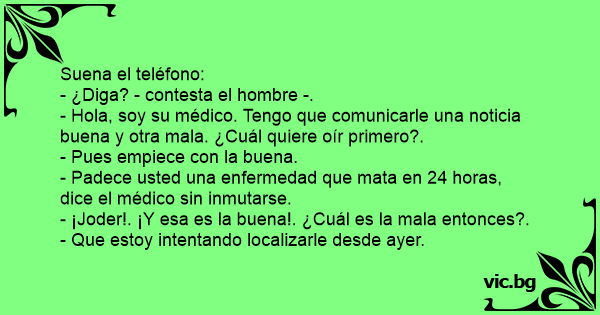 - Hola, soy su médico. Tengo que comunicarle una noticia buena y otra mala. ¿Cuál quiere oír primero?.