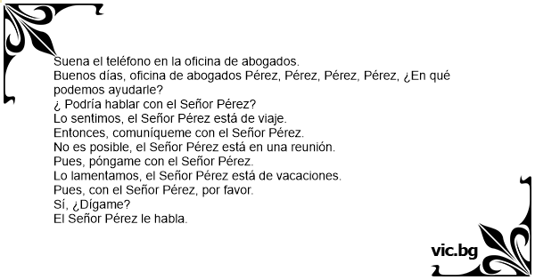 Buenos días, oficina de abogados Pérez, Pérez, Pérez, Pérez, ¿En qué podemos ayudarle?