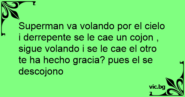 Superman va volando por el cielo i derrepente se le cae un cojon , sigue volando i se le cae el otro te ha hecho gracia? pues el se descojono