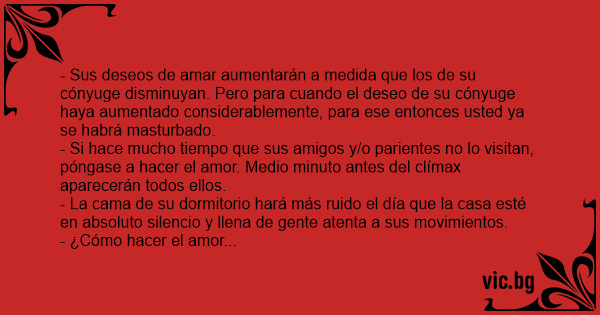- Sus deseos de amar aumentarán a medida que los de su cónyuge disminuyan. Pero para cuando el deseo de su cónyuge haya aumentado considerablemente, para ese entonces usted ya se habrá masturbado.