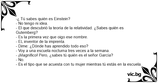 Egy férfi beszélget a haverjával: - Képzeld amióta esti iskolába járok, sok mindent megtudtam. Te tudod ki az az Einstein? - Nem én. - És tudod ki az a Neumann János? - Nem én. A másik fickó: - És...