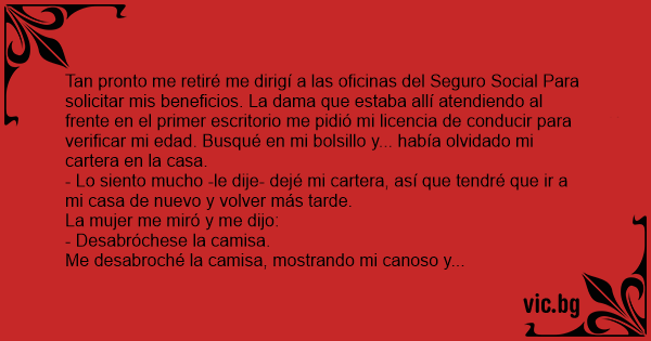 Tan pronto me retiré me dirigí a las oficinas del Seguro Social Para solicitar mis beneficios. La dama que estaba allí atendiendo al frente en el primer escritorio me pidió mi licencia de conducir para verificar mi edad. Busqué en mi bolsillo y... había olvidado mi cartera en la casa.