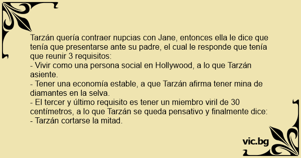 Tarzán quería contraer nupcias соn Jane, entonces ella le dice que tenía que presentarse ante su padre, el cual le responde que tenía que reunir 3 requisitos: