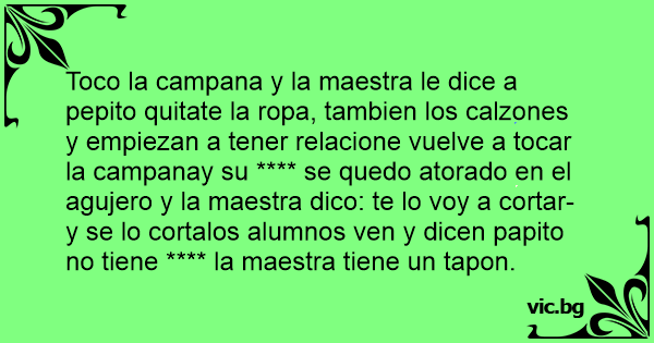 Toco la campana y la maestra le dice a pepito quitate la ropa, tambien los calzones y empiezan a tener relacione vuelve a tocar la campanay su **** se quedo atorado en el agujero y la maestra dico: te lo voy a cortar- y se lo cortalos alumnos ven y dicen papito no tiene **** la maestra tiene un tapon.