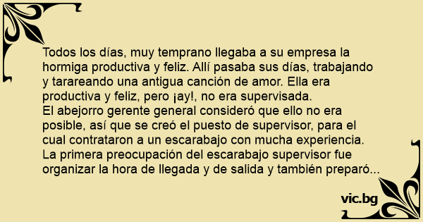 Todos los días, muy temprano llegaba a su empresa la hormiga productiva y feliz. Allí pasaba sus días, trabajando y tarareando una antigua canción de amor. Ella era productiva y feliz, pero ¡ay!, no era supervisada.