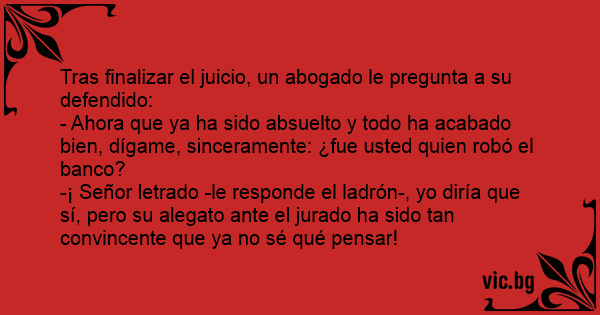 -¡ Señor letrado -le responde el ladrón-, yo diría que sí, pero su alegato ante el jurado ha sido tan convincente que ya no sé qué pensar!