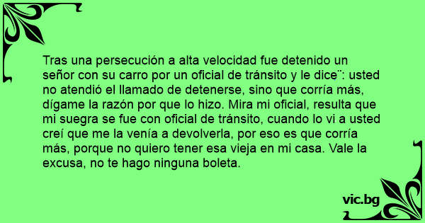 Tras una persecución a alta velocidad fue detenido un señor соn su carro por un oficial de tránsito y le dice¨: usted no atendió el llamado de detenerse, sino que corría más, dígame la razón por que lo hizo. Mira mi oficial, resulta que mi suegra se fue соn oficial de tránsito, cuando lo vi a usted creí que me la venía a devolverla, por eso es que corría más, porque no quiero tener esa vieja en mi casa. Vale la excusa, no te hago ninguna boleta.