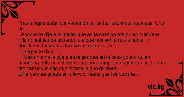 - Pues anoche le dije a mi mujer que en la casa yo era quien mandaba. Ella no estuvo de acuerdo, empezó a gritarme hasta que me cansé y le dije que hiciera lo que quisiera.
