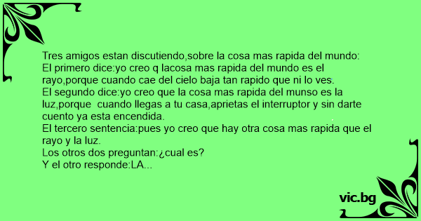 El primero dice:yo creo q lacosa mas rapida del mundo es el rayo,porque cuando cae del cielo baja tan rapido que ni lo ves.