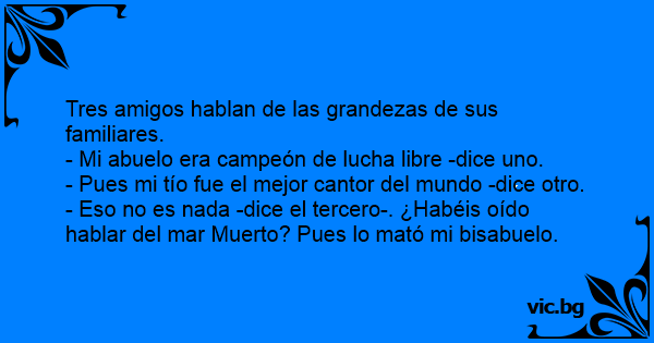 - Eso no es nada -dice el tercero-. ¿Habéis oído hablar del mar Muerto? Pues lo mató mi bisabuelo.