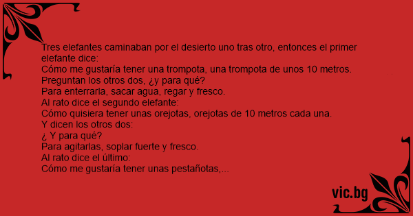 Tres elefantes caminaban por el desierto uno tras otro, entonces el primer elefante dice: