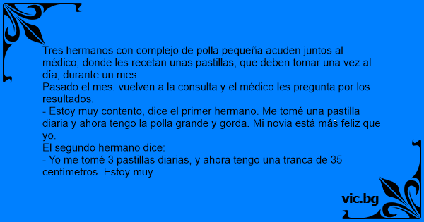 - Estoy muy contento, dice el primer hermano. Me tomé una pastilla diaria y ahora tengo la роllа grande y gorda. Mi novia está más feliz que yo.