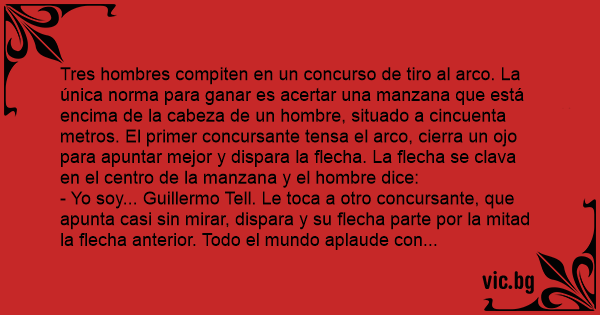 Tres hombres compiten en un concurso de tiro al arco. La única norma para ganar es acertar una manzana que está encima de la cabeza de un hombre, situado a cincuenta metros. El primer concursante tensa el arco, cierra un ojo para apuntar mejor y dispara la flecha. La flecha se clava en el centro de la manzana y el hombre dice: