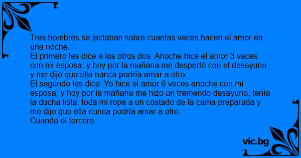 El primero les dice a los otros dos: Anoche hice el amor 3 veces соn mi esposa, y hoy por la mañana me despertó соn el desayuno y me dijo que ella nunca podría amar a otro.