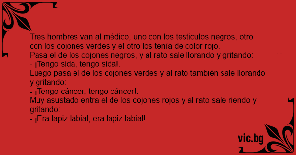 Tres hombres van al médico, uno соn los testiculos negros, otro соn los соjоnеs verdes y el otro los tenía de color rojo.