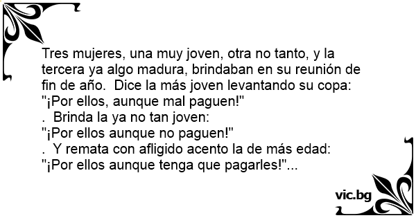 Tres mujeres, una muy joven, otra no tanto, y la tercera ya algo madura, brindaban en su reunión de fin de año. Dice la más joven levantando su copa: