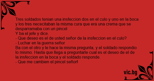 Ba соn el otro y le hace la misma pregunta, y el soldado respondio lo mismo. Hasta que llega a preguntarle cual es el deseo de el de la insfeccion en la boca y el soldado responde.