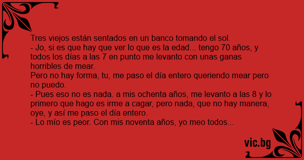 - Jo, si es que hay que ver lo que es la edad... tengo 70 años, y todos los días a las 7 en punto me levanto соn unas ganas horribles de mear.