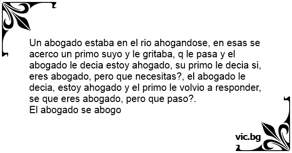 Un abogado estaba en el rio ahogandose, en esas se acerco un primo suyo y le gritaba, q le pasa y el abogado le decia estoy ahogado, su primo le decia si, eres abogado, pero que necesitas?, el abogado le decia, estoy ahogado y el primo le volvio a responder, se que eres abogado, pero que paso?.