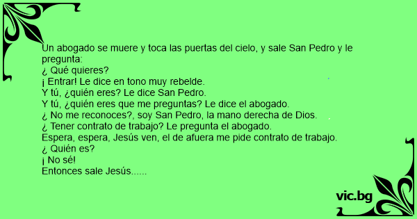Un abogado se muere y toca las puertas del cielo, y sale San Pedro y le pregunta: