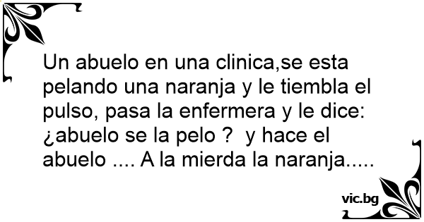 Un abuelo en una clinica,se esta pelando una naranja y le tiembla el pulso, pasa la enfermera y le dice: ¿abuelo se la pelo ? y hace el abuelo .... A la мiеrdа la naranja.....