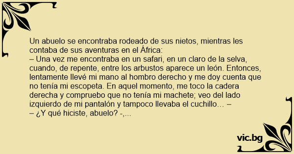 – Una vez me encontraba en un safari, en un claro de la selva, cuando, de repente, entre los arbustos aparece un león. Entonces, lentamente llevé mi mano al hombro derecho y me doy cuenta que no tenía mi escopeta. En aquel momento, me toco la cadera derecha y compruebo que no tenía mi machete; veo del lado izquierdo de mi pantalón y tampoco llevaba el cuchillo… –
