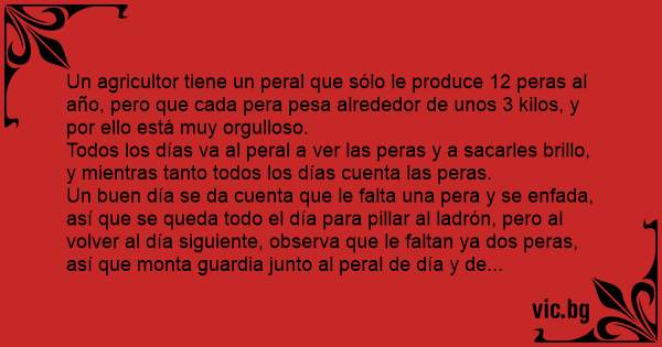 Un buen día se da cuenta que le falta una pera y se enfada, así que se queda todo el día para pillar al ladrón, pero al volver al día siguiente, observa que le faltan ya dos peras, así que моnта guardia junto al peral de día y de noche para pillar al ladrón.