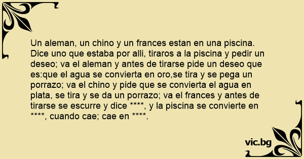 Un aleman, un chino y un frances estan en una piscina. Dice uno que estaba por alli, tiraros a la piscina y pedir un deseo; va el aleman y antes de tirarse pide un deseo que es:que el agua se convierta en oro,se tira y se pega un porrazo; va el chino y pide que se convierta el agua en plata, se tira y se da un porrazo; va el frances y antes de tirarse se escurre y dice ****, y la piscina se convierte en ****, cuando cae; cae en ****.